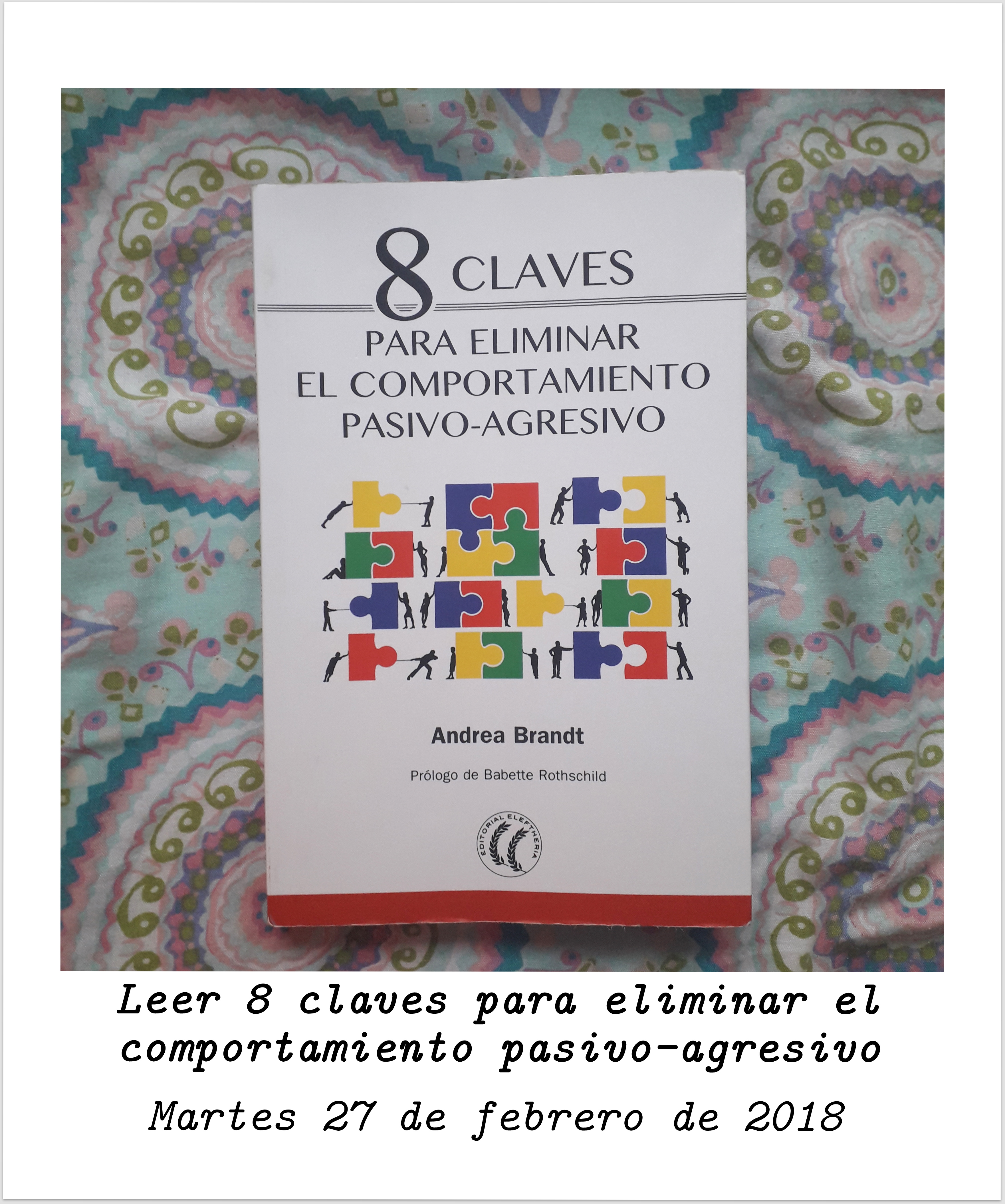 El Martes 27 de febrero de 2018 terminé el apasionante libro de psicología. Creo que es un libro que da herramientas muy útiles incluso cuando no se es propiamente pasivo-agresivo, porque siempre surgen situaciones, conductas o facilitadores de estos comportamientos, tanto la visión mindfulness como la asertividad se pueden aplicar en cualquier plano y en cualquier contexto. Es un libro plagado de ejemplos y técnicas al que vienen bien caer de vez en cuando para consultarlo y extraer en cada visita cosas nuevas. 8 Claves para eliminar el comportamiento pasivo-agresivo de Andrea Brandt - Realizar el curso de Formación Básica para la Juventud