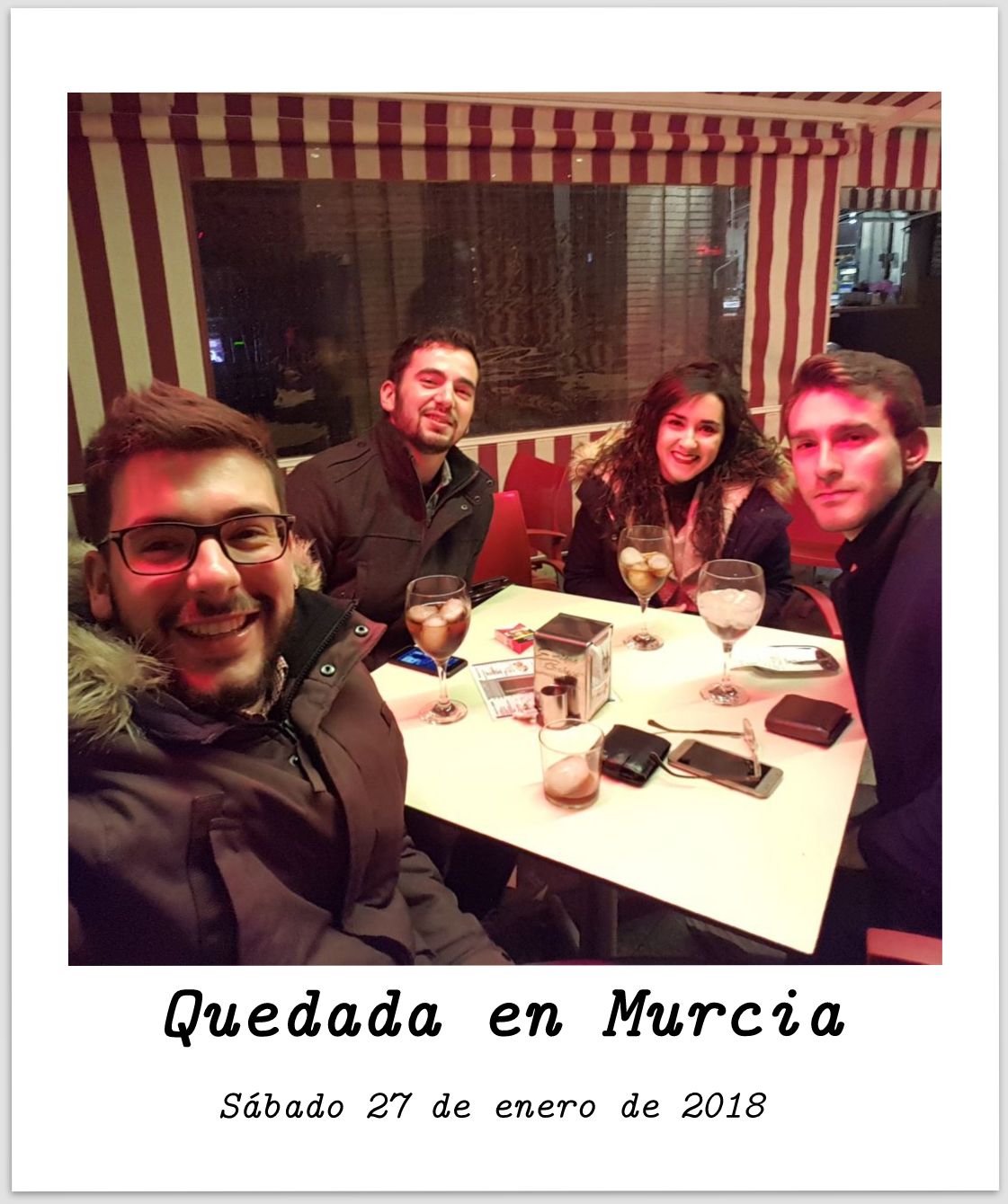 El sábado 27 de enero de 2018 después del curso de Cruz Roja me habló Bryan que se pasaba por Murcia, y si bien es cierto que estaba destrozado después de 7 horas de curso y con muchas emociones a flor de piel decidí irme a cenar con ellos. Mereció la pena, nos pusimos al día y estuvimos cerveceando por el Príncipe de Gales y cenamos en el Mesón de Murcia en la Plaza de las Flores. Después como empezó a llover los cubatas nos los tomamos en el mismo lugar. Volviendo a casa nos calamos.Quedada en Murcia. - Hacer una carta de amor