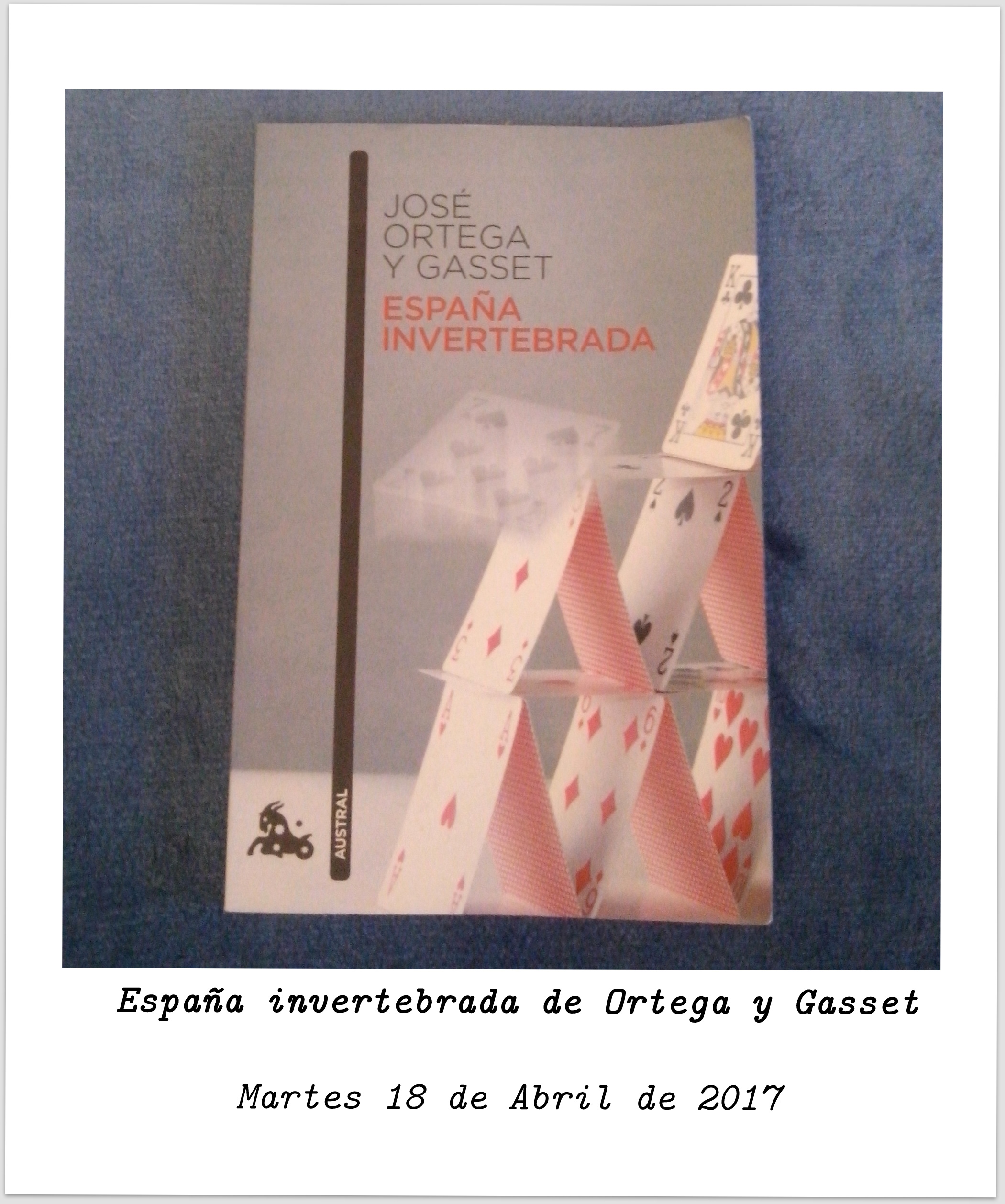 El martes 18 de Abril de 2017 terminé el libro de Ortega que tuve en mis manos el lunes 3 de Abril del mismo año. En pos de conocer un poco más sobre filosofía y, sobre todo, filosofía contemporánea española elegí a Ortega y su España invertebrada. Comencé a leer algunas lineas hace ya algunos meses y lo que leí me sorprendió muy gratamente, como el libro era de mi hermano y no me lo pude llevar a Valencia decidí comprarlo. Sinceramente cada linea me ha sorprendido. Creo que engloba perfectamente muchos de los problemas de la sociedad española en la que vivimos, aunque discrepo en el último capítulo creo que es una lectura obligada para cualquier hijo del pueblo español que desee renunciar a una miscela de egoismos para crecer con miras al futuro. España invertebrada de José Ortega y Gasset. - Ir a Titaguas