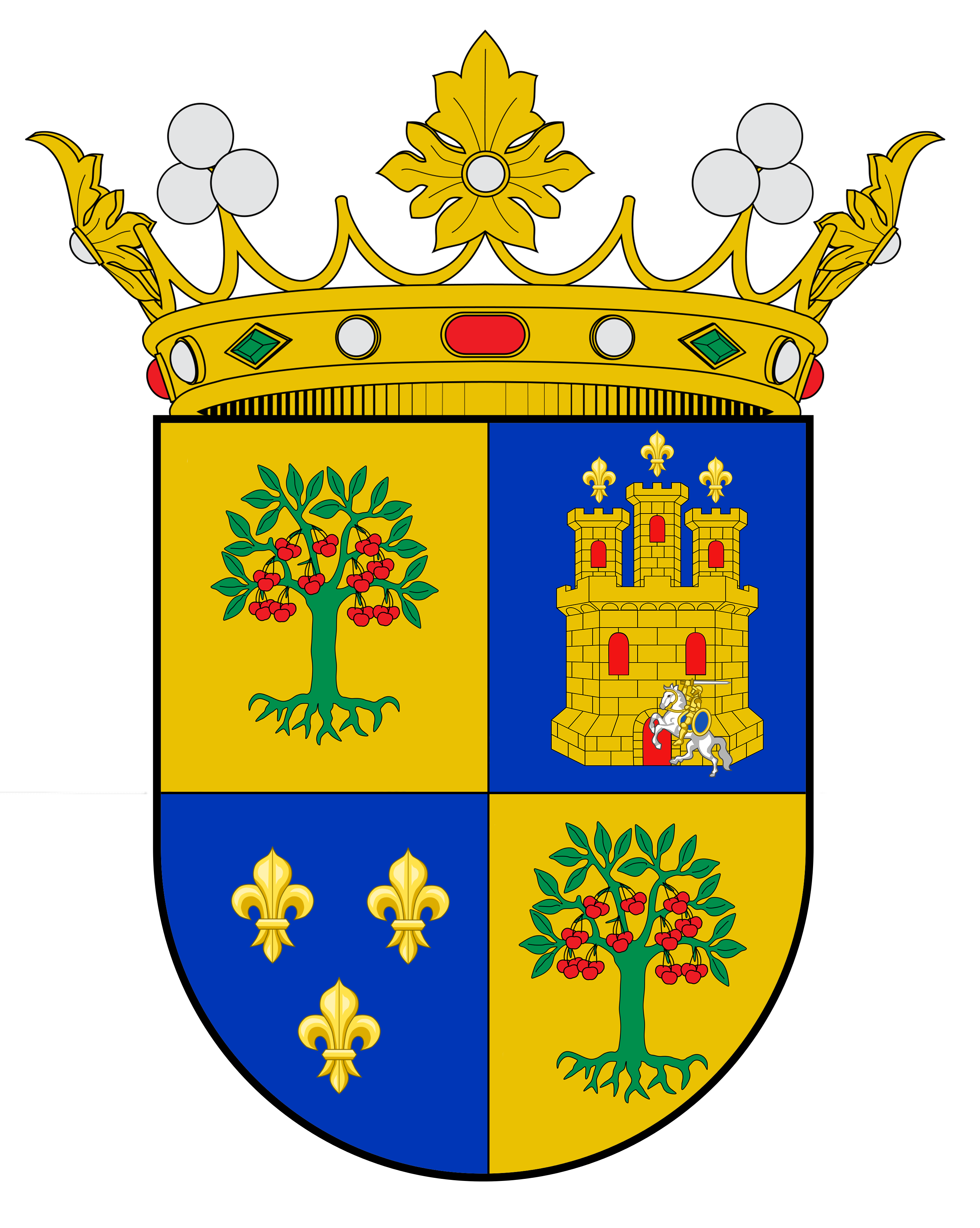 Escudo cuartelado; primer y cuarto, en campo de oro, un cerezo de sinople en fruto de gules, segundo, en campo de azur, un castillo de oro, mazonado de sable y aclarado en gules con tres donjones almenados surmontados de tres flores de lis de oro, puerta custodiada por un jinete a caballo en plata y armadura en oro con una espada desnuda en la mano diestra y rodela en la montura, y tercero, en campo de azur, tres flores de lis de oro. Escudo del Marquesado de Cerezo-Martínez - Leer Armas, Gérmenes y Acero de Jared Diamond